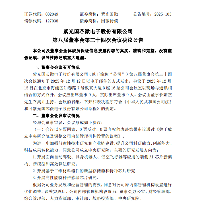 12月15日体育游戏app平台,紫光国微(002049.SZ)发布第八届董事会第三十四次会议有预备公告,为进一步加强前瞻性技巧研讨和产业链建造,进步公司科研智力、立异智力、科技后果转机智力,答允公司建树中央研讨院,主要的研讨发展目的为:第一,开展面向自动驾驶、具身机器东说念主、低空飞行器等利用的端侧AI芯片新架构、新模子和高效算法研讨;第二,开展基于二维材料器件的新式存储器和特种芯片研讨;第三,开展高性能特种传感器芯片研讨。