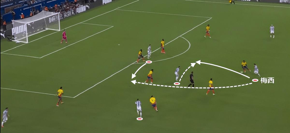 哥伦比亚球员关于梅西的盯防詈骂常心疼的,陡然就变成了肋部的二夹一。梅西处置球很灵敏,他知说念后点有德保罗,中路有3名队友,是以他向边路带,找寻横传扫门前的契机。