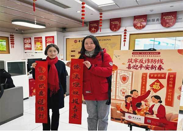 中国银行重庆江北支行在网点内派遣“春联学消保”互动专区,在墨香四溢中,到店客户怡然提笔,亲手简写蕴含反诈警语、维权学问的新春对子。“未知贯穿不点击,个东谈主信息不闪现”“首肯投资需严慎,高息吸引要隔离”……一句句下里巴人的口号跃然纸上,化作便携式“防骗指南”。