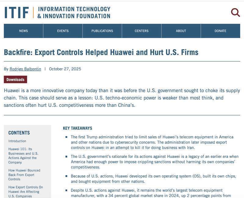 你的位置:云开(中国)Kaiyun·官方网站-登录入口 > 新闻资讯 >中国后生报客户端讯(中青报·中青网见习记者 马子倩 记者 贾晓静)在解放贸易是全球经济主旋律的时期,企图使用单边技巧对中国科技“卡脖子”的好意思国,似乎正在搬砖砸脚。好意思国着名非渔利性大师计谋智库“好意思国信息技艺与转换基金会”(ITIF)10月27日发布辩论证据称,好意思国蹧蹋出口经管要领、对以华为为代表的中国科技企业履行司法和行动制裁,助力华为成为“更苍劲的竞争敌手”,反过来却毁伤了好意思国科技公司的利益。